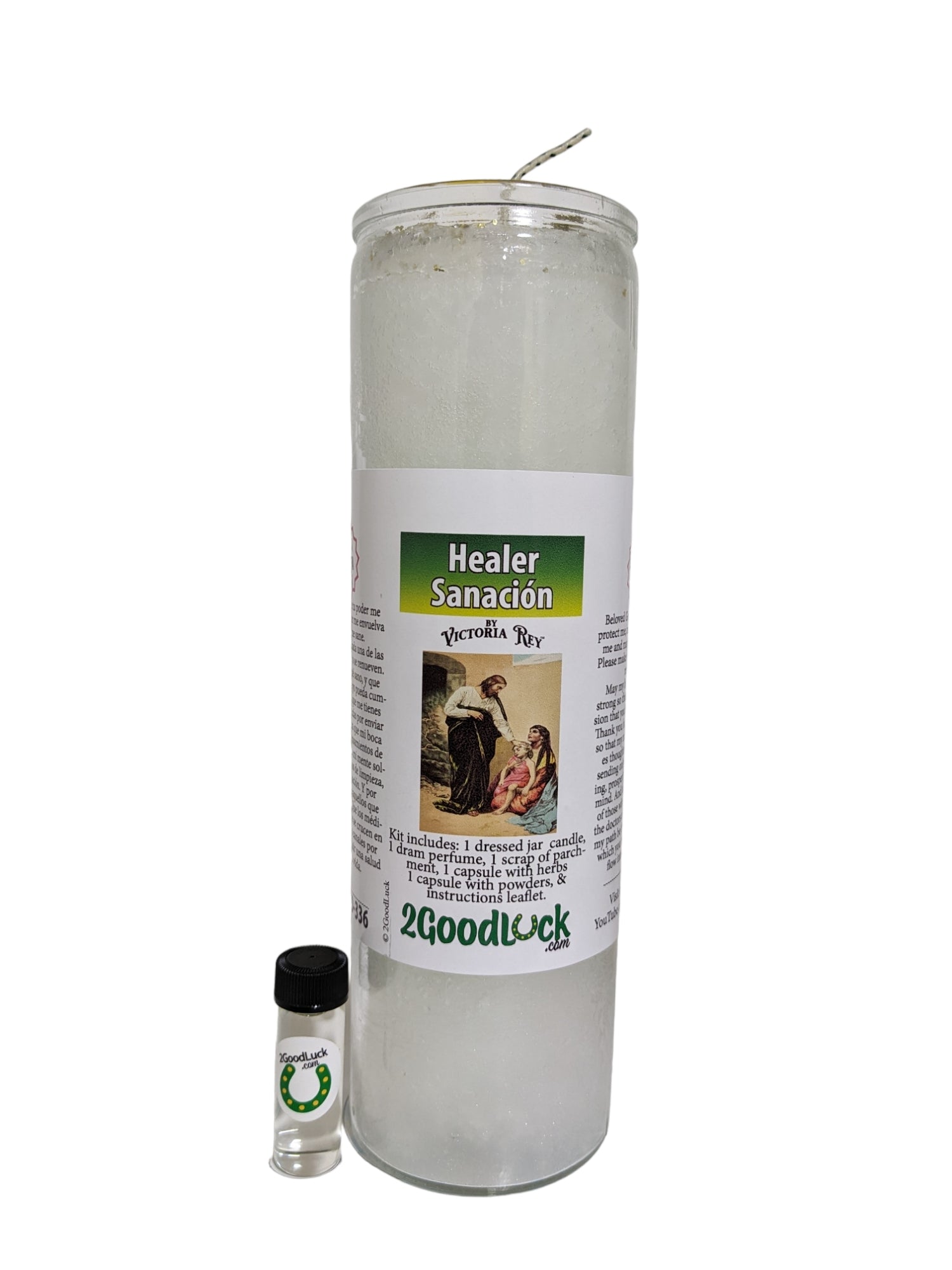 A Healer dressed candle in a jar is a powerful tool used to promote healing and well-being. It is made of wax and comes with a capsule of herbs, a capsule of powders, and a perfume dram that are said to have healing energies. The candle is also accompanied by a booklet of instructions that will guide you through the ritual of burning the candle.