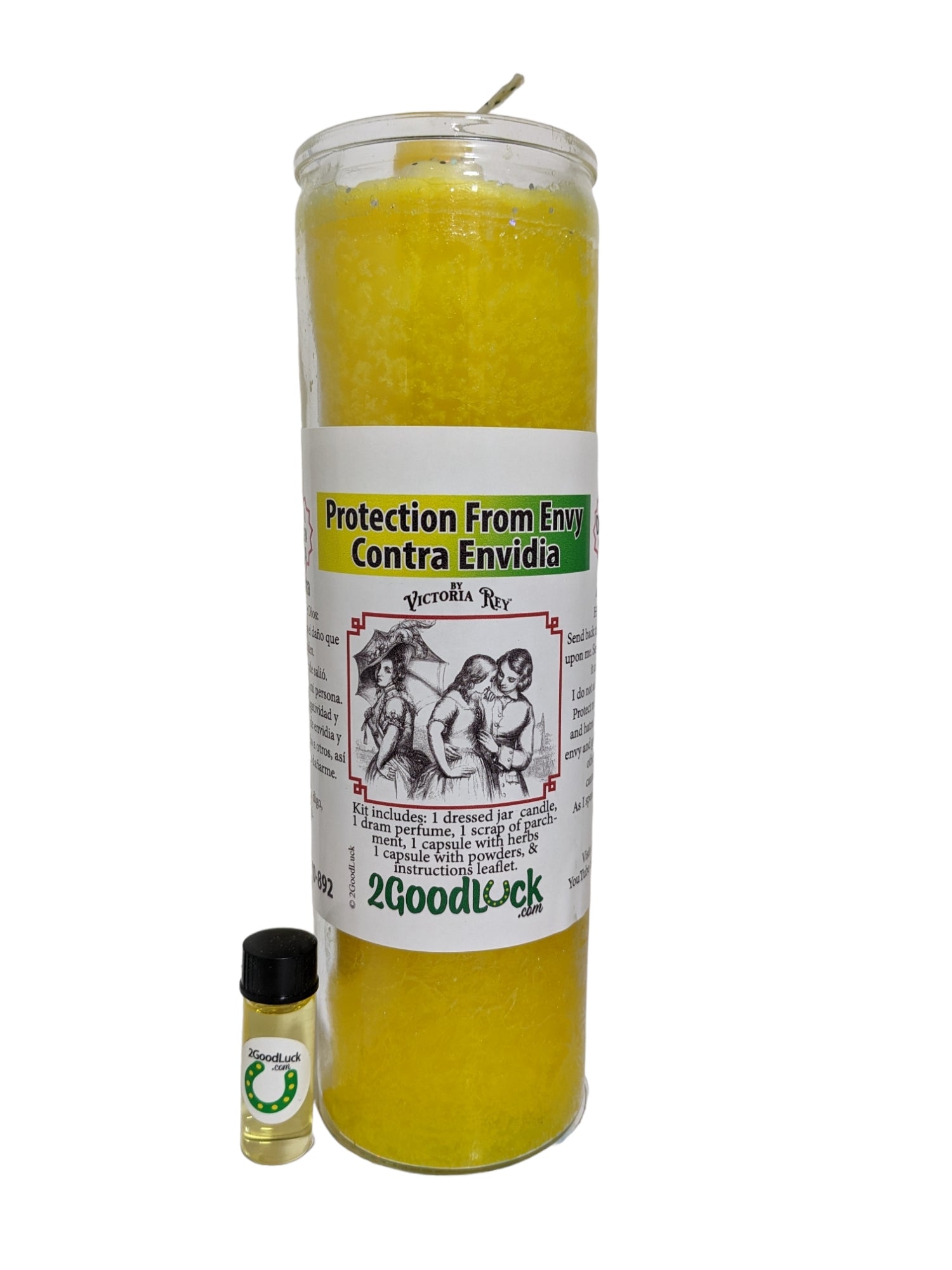 Kit includes: 1 dram perfume, herbs, powders and a scrap of parchment along with instructions booklet for your ritual. Plus a powerful prayer to help you focus your energy on the results you desire. Burn this candle to protect yourself from evil and envious people.